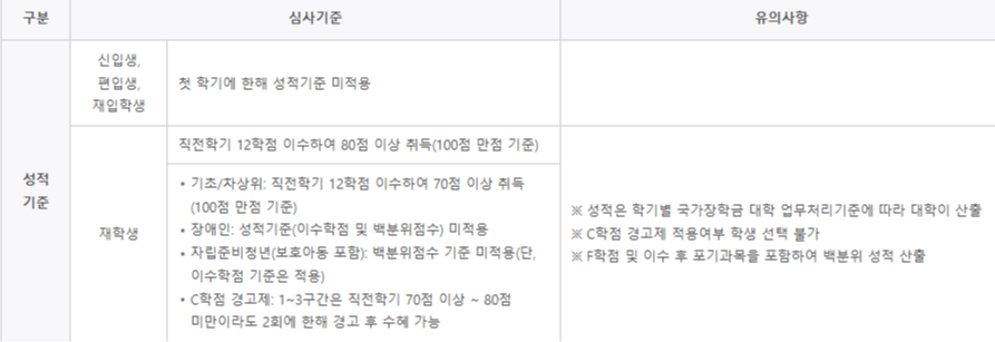심사 기준인 성적 기준, 재단 정보 심사 등 자세한 사항은 아래 표를 참고하시기를 바랍니다.